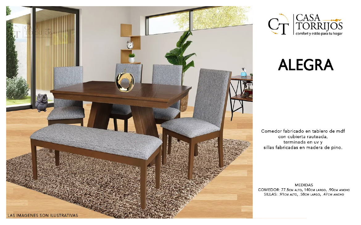 El comedor Alegra fusiona líneas contemporáneas con la calidez de la madera. Su mesa en acabado nogal con cubierta rauteada añade textura y personalidad, mientras que las sillas y la banca tapizadas en gris aportan comodidad y elegancia. Es ideal para espacios modernos que buscan practicidad sin sacrificar estilo, ya que ofrece capacidad para seis personas con un banco versátil.