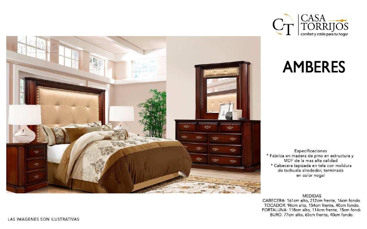 - La recámara Amberes ofrece un aire clásico gracias a su acabado en nogal y a las molduras decorativas con tachuelas. La cabecera tapizada aporta calidez y confort, mientras que el tocador y el portaluna proporcionan espacio de almacenamiento y organización. Ideal para quienes buscan un dormitorio sobrio y elegante.
