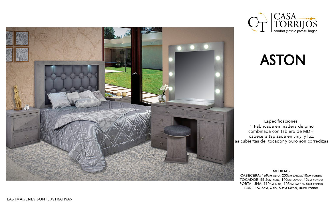 - La recámara Aston brinda un look moderno gracias a su cabecera acolchada con iluminación LED y al tocador estilo vanity con luces. Es perfecta para crear un ambiente sofisticado y funcional, ideal para arreglarse y descansar en un mismo espacio.