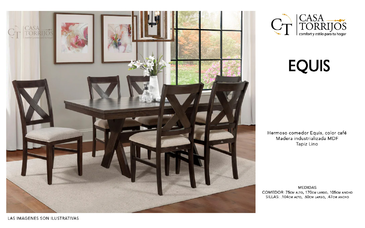 - El modelo Equis destaca por el detalle en cruz de sus respaldos, que le da un toque rústico‑moderno. La combinación de madera oscura y tapicería clara resulta versátil y muy fácil de armonizar con otros muebles. Ideal para comedores tradicionales que buscan un diseño distinguido sin perder comodidad.