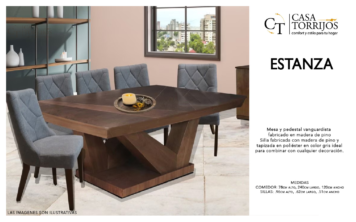 - El comedor Estanza está pensado para espacios amplios y propietarios que buscan una pieza protagonista. Su pedestal en forma de triángulo cruzado ofrece gran estabilidad y un estilo contemporáneo. Las sillas tapizadas en gris son elegantes y confortables, lo que convierte a Estanza en el centro perfecto de reuniones familiares o de negocios en casa.
