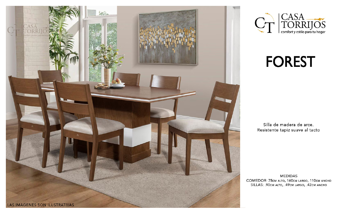 Reseña y texto de venta: Inspirado en la naturaleza, el comedor Forest combina la nobleza de la madera con líneas simples que aportan serenidad al hogar. La calidez del tono café y el detalle de la franja blanca en la base crean un contraste moderno. Es perfecto para quienes desean una atmósfera acogedora y atemporal.