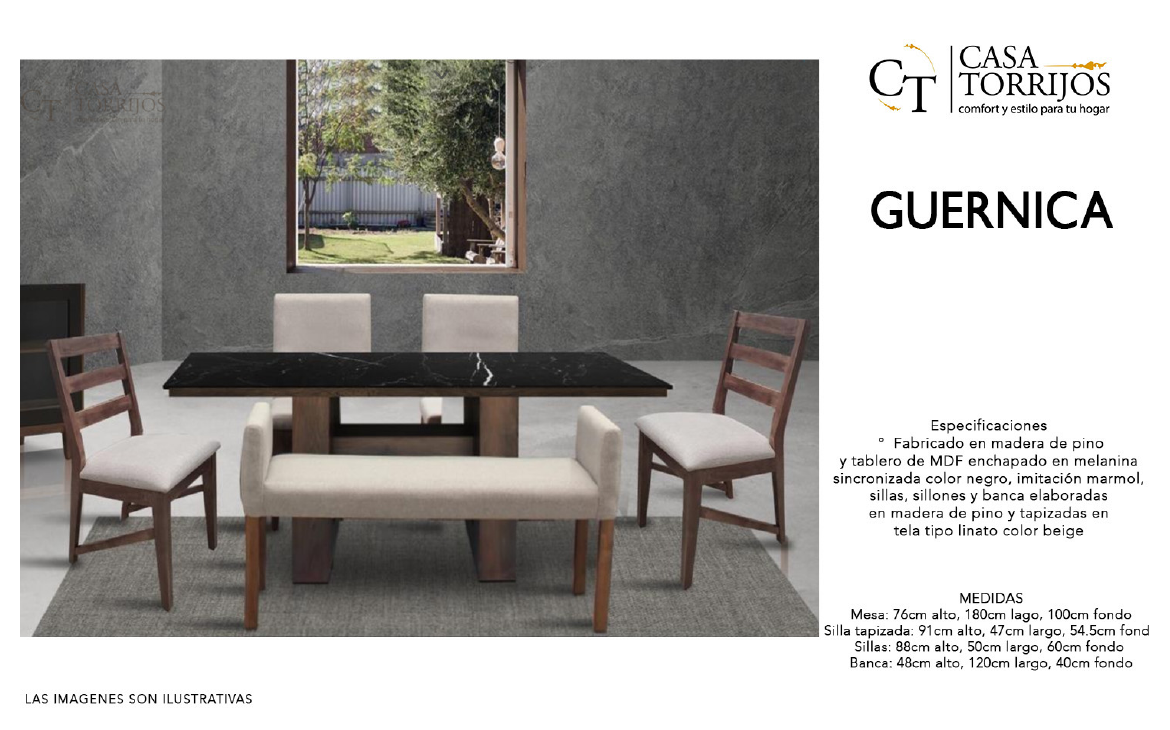 Guernica es sinónimo de lujo asequible. El tablero con acabado marmoleado aporta un toque sofisticado, mientras que las sillas beige equilibran la estética y ofrecen comodidad. Su mezcla de elementos clásicos y modernos lo convierten en una pieza versátil que realza cualquier comedor.