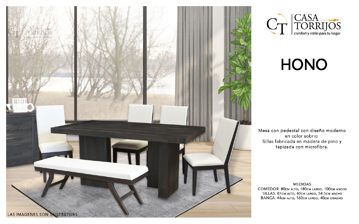 - El comedor Hono se caracteriza por su elegancia discreta. La mesa en tono chocolate contrasta con la tapicería beige de sillas y banca, generando un equilibrio visual. Su pedestal central añade un aire contemporáneo, ideal para ambientes urbanos.
