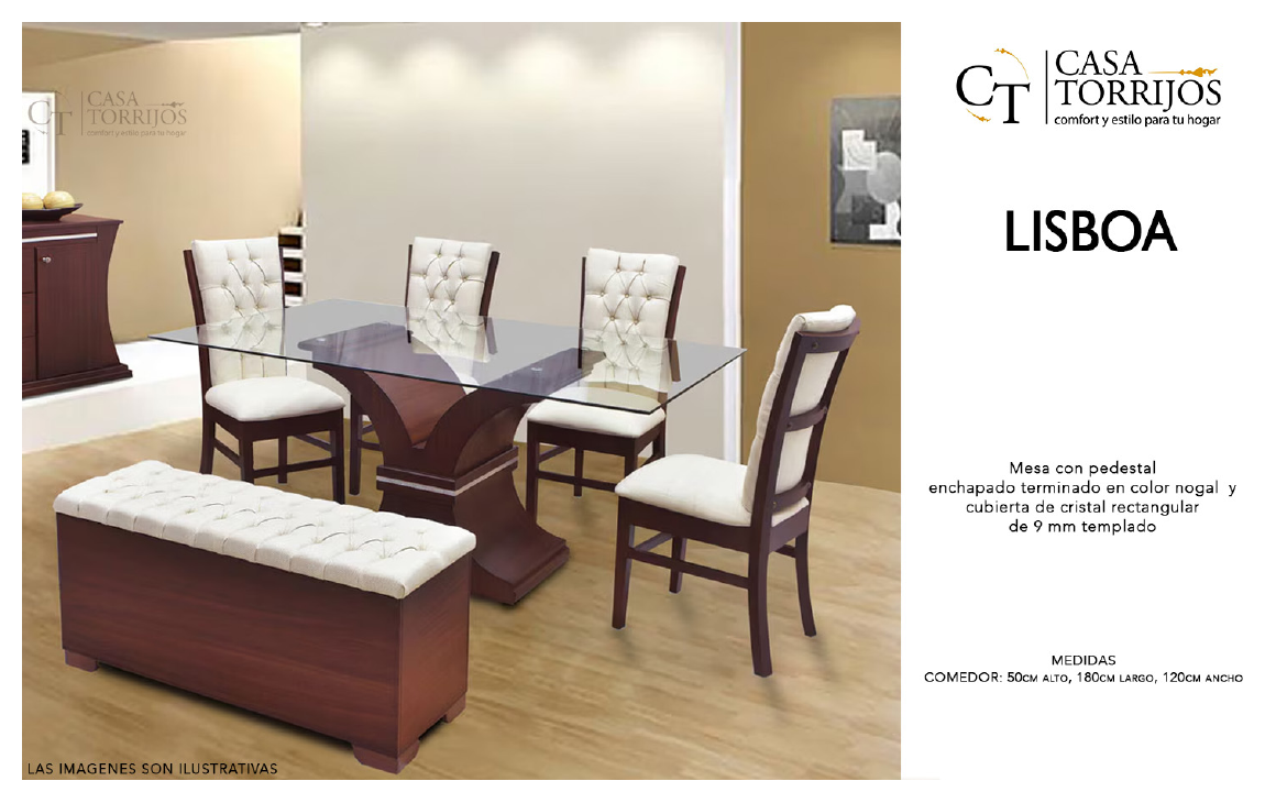 - Lisboa ofrece una mezcla entre lo clásico y lo moderno gracias a su pedestal curvo y tapa de cristal templado. La banca y las sillas capitoné aportan elegancia y comodidad, convirtiéndolo en un comedor distinguido que se adapta a espacios formales o familiares.
