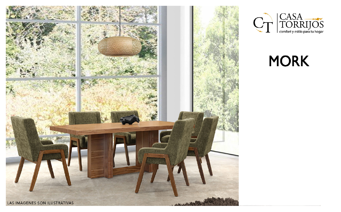 - Mork apuesta por la comodidad gracias a sus sillas de respaldo alto y tapizado suave. La mesa en tono natural contrasta con la textura cálida del tapiz verde, ofreciendo un look mid‑century moderno. Es perfecta para quienes buscan añadir color y calidez sin perder elegancia.