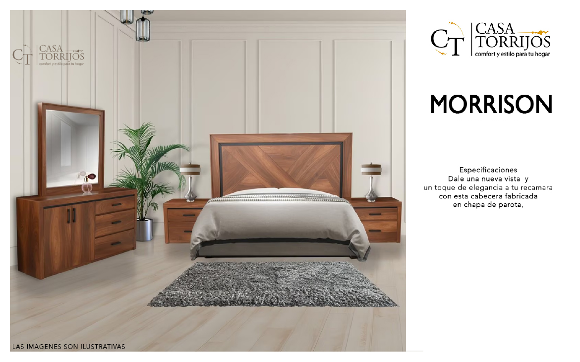 Morrison ofrece un diseño audaz gracias a la veta de la madera de parota dispuesta en patrones diagonales. La cabecera es el punto focal del dormitorio, aportando calidez y carácter. Ideal para habitaciones que buscan una pieza protagonista de inspiración contemporánea.