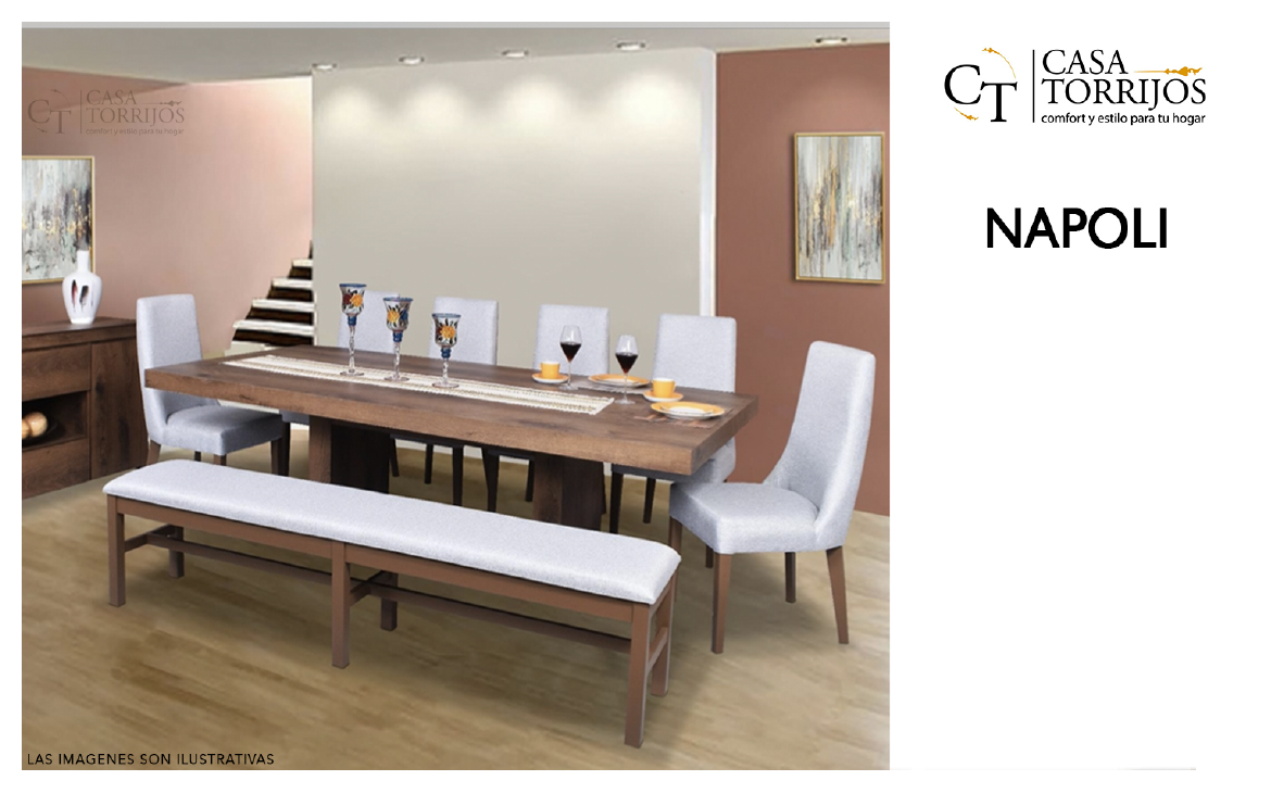 Reseña y texto de venta: El comedor Napoli realza cualquier espacio con su estructura sólida y acabado cálido. Sus sillas de alto respaldo y la banca acolchonada permiten acomodar a numerosos invitados con estilo. Ideal para familias grandes o para quienes disfrutan de reuniones festivas.