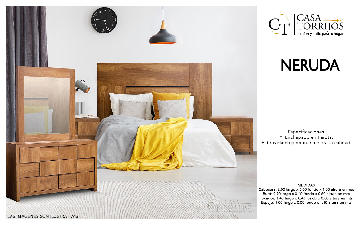 La recámara Neruda destaca por su cabecera amplia en madera de parota, que aporta calidez y naturalidad. Sus líneas simples se adaptan fácilmente a estilos rústicos o modernos. La combinación de muebles ofrece almacenamiento generoso y un diseño armónico.