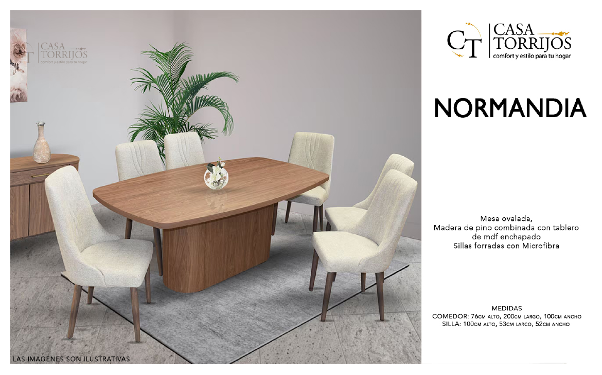 - La forma ovalada del comedor Normandia favorece la circulación alrededor de la mesa y suaviza los espacios. Su acabado en madera natural se complementa con sillas mullidas, creando un conjunto acogedor y elegante. Perfecto para ambientes escandinavos o clásicos