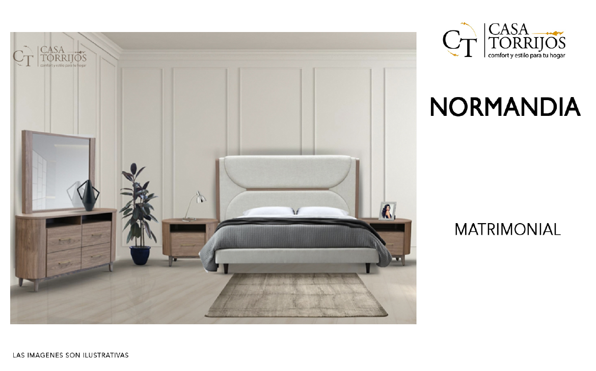 - La recámara Normandia presenta un diseño suave y contemporáneo. La cabecera acolchonada con formas curvas crea un punto de descanso acogedor, mientras que los burós y el tocador muestran un estilo nórdico limpio. Ideal para habitaciones que buscan un ambiente relajado.