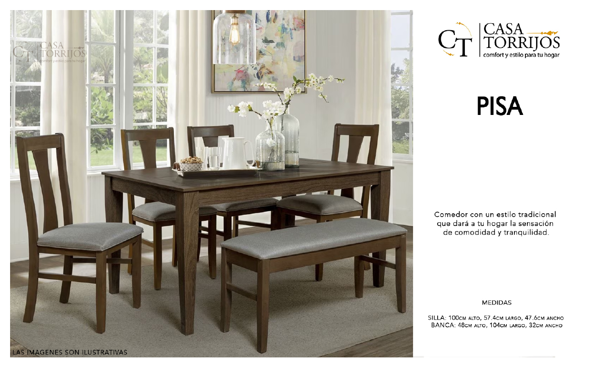 - Pisa evoca la calidez de un comedor clásico. Las sillas de líneas rectas y el banco tapizado en gris invitan a convivir en un ambiente relajado. La robustez de la madera asegura durabilidad, mientras que su diseño tradicional transmite tranquilidad y armonía.