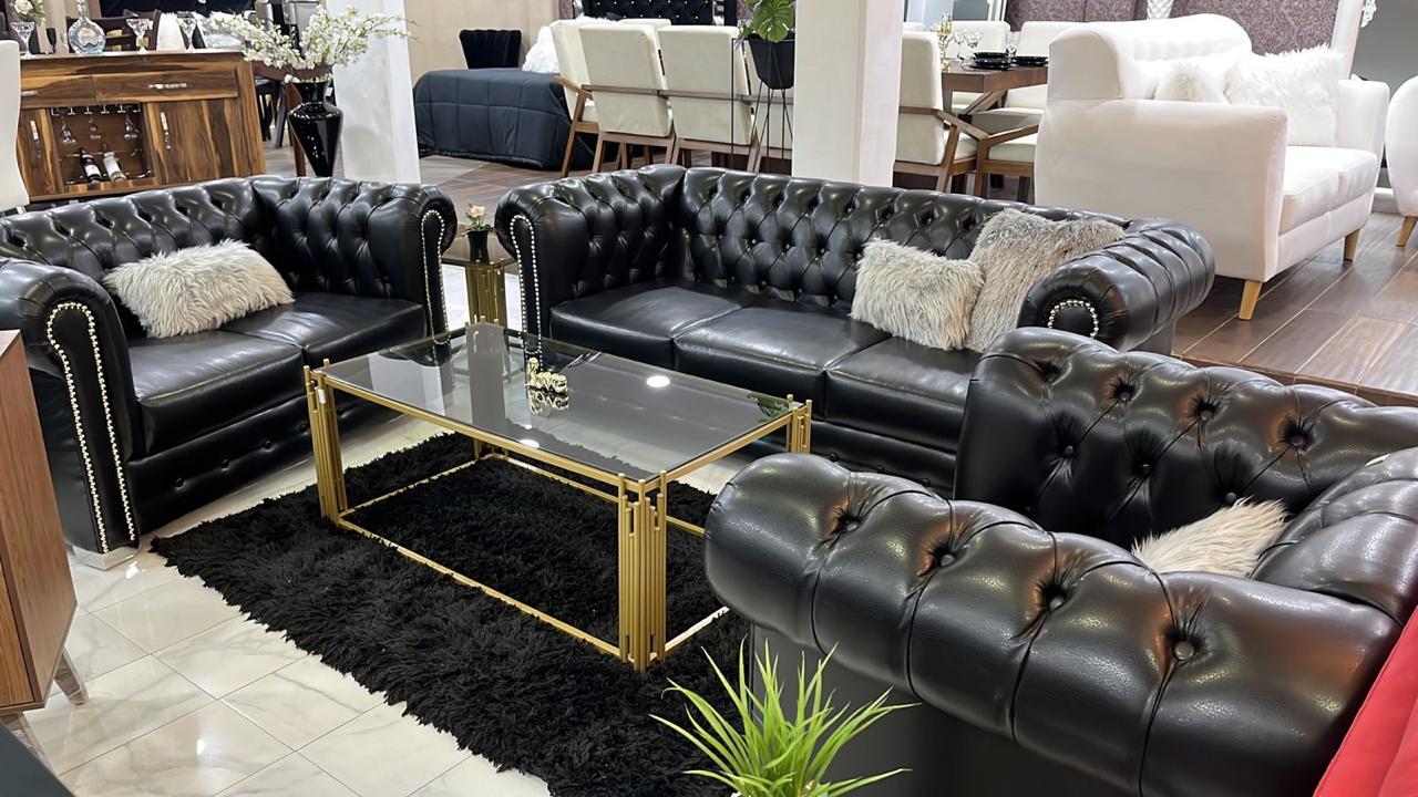 ·Conjunto estilo Chesterfield tapizado en piel sintética negra.