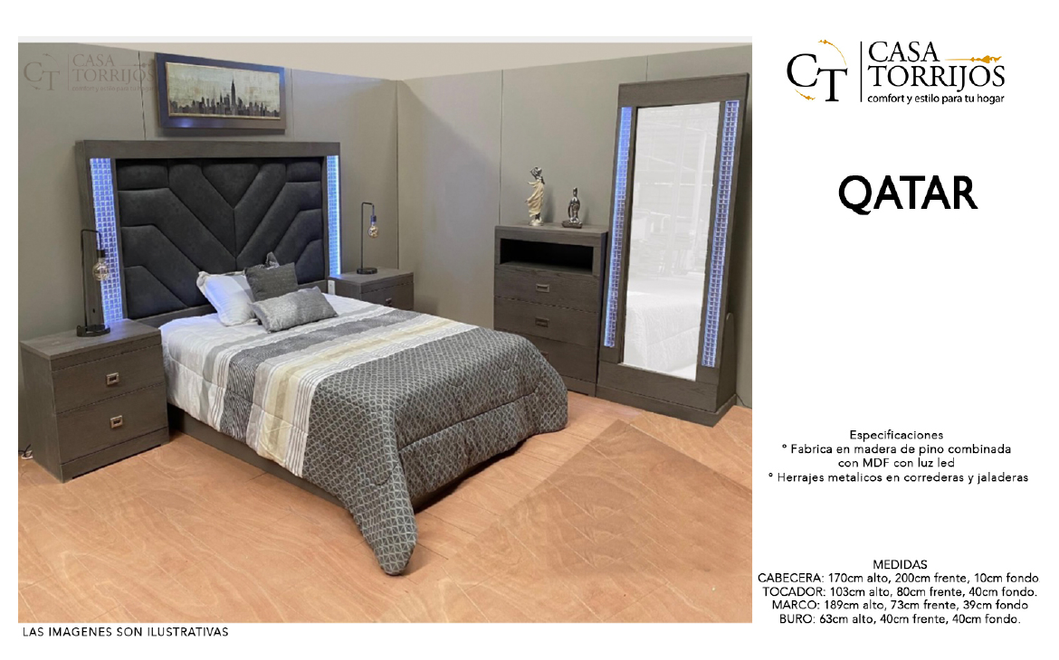 - La recámara Qatar aporta modernidad y funcionalidad gracias a su iluminación LED que enmarca tanto la cabecera como el espejo. Los herrajes metálicos brindan durabilidad, mientras que sus líneas rectas y acabados en gris oscuro crean un ambiente contemporáneo. Perfecta para quienes buscan tecnología y estilo en su dormitorio.