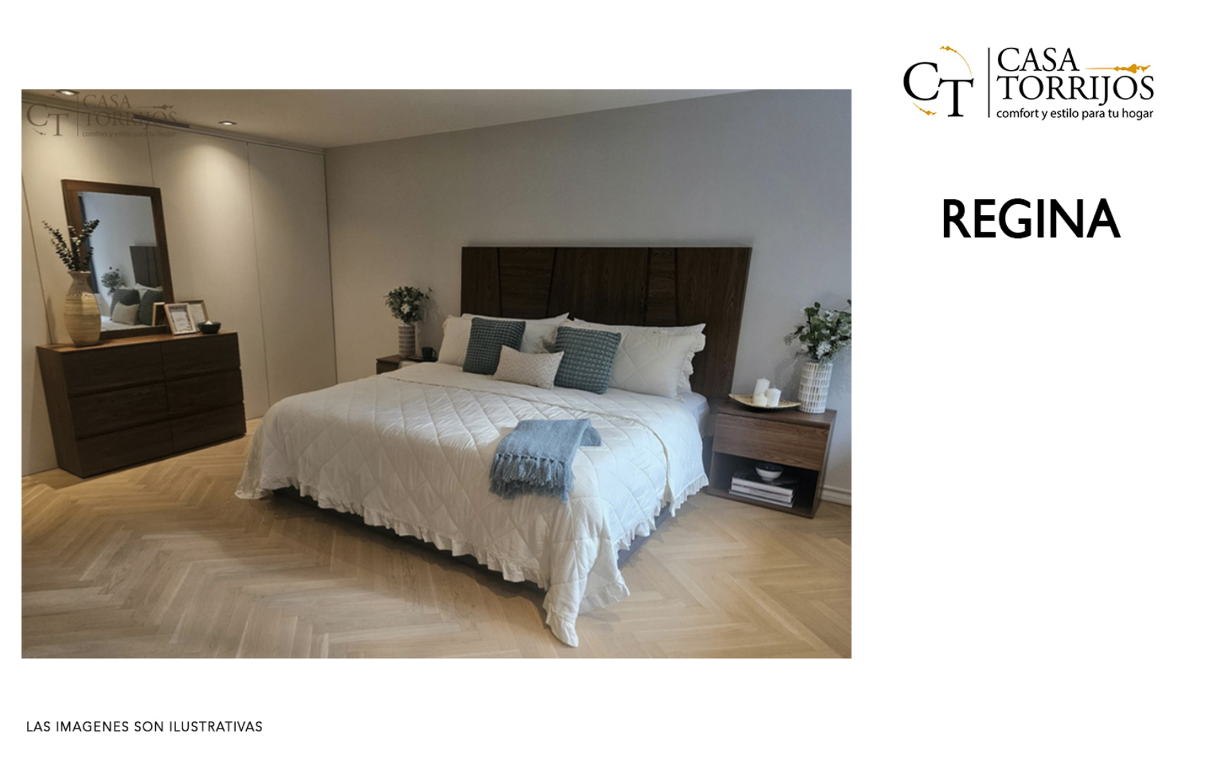 - Regina presenta una estética minimalista con un toque escandinavo. La cabecera de madera oscura contrasta con la ropa de cama clara, creando un ambiente elegante y relajante. Ideal para quienes prefieren dormitorios discretos y funcionales.