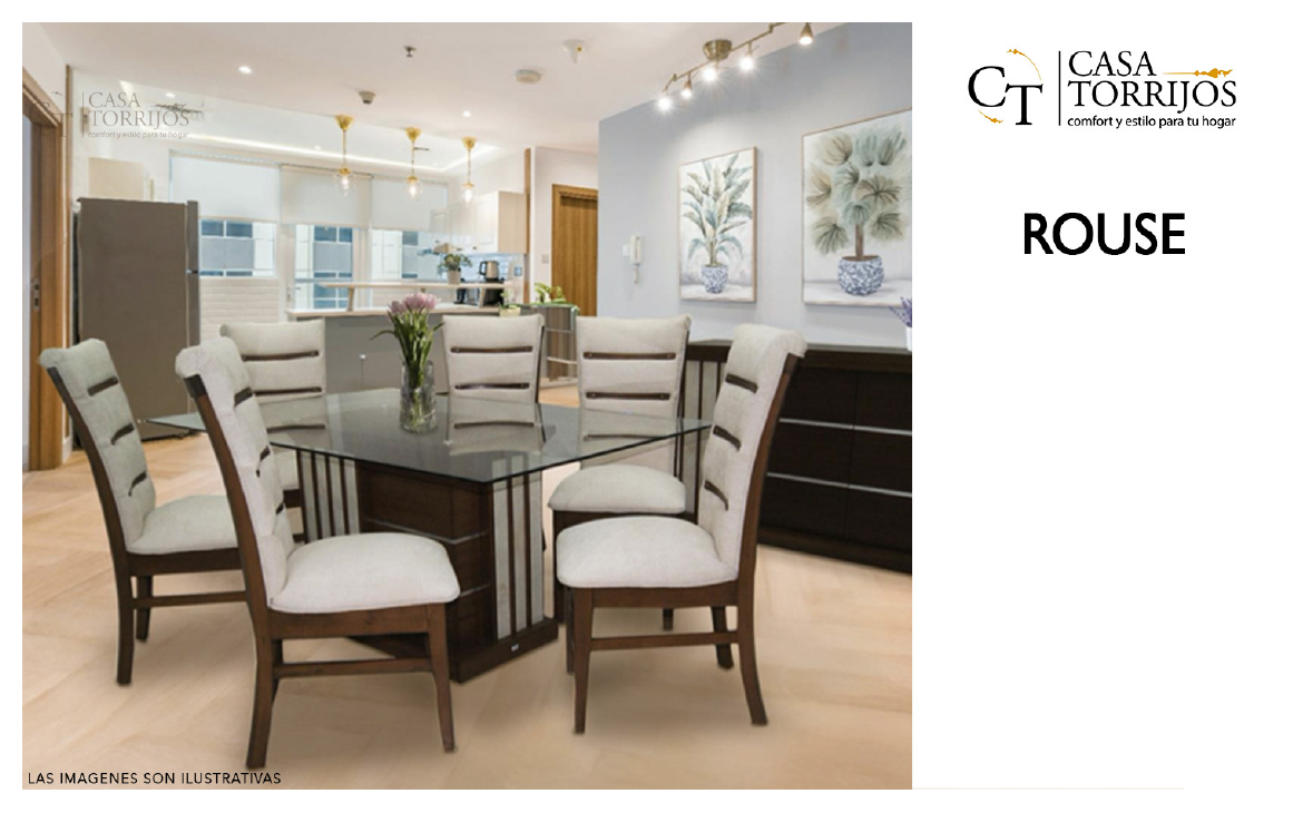 El comedor Rouse destaca por su mesa de cristal templado que aporta ligereza visual. Su base oscura con listones verticales se complementa con las sillas de respaldo alto, creando un conjunto elegante y moderno. Perfecto para departamentos u oficinas ejecutivas en casa.