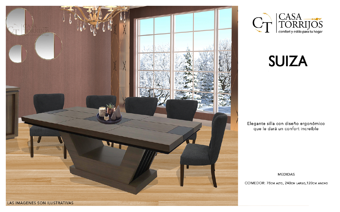 El comedor Suiza conjuga diseño moderno y confort. El detalle de su tablero dividido en paneles aporta dinamismo, mientras que las sillas ergonómicas garantizan largas sobremesas cómodas. Una pieza ideal para quienes buscan un comedor diferente y sofisticado.