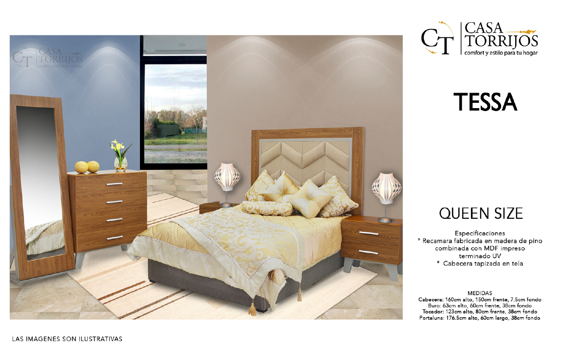 - Recámara Queen Size fabricada en pino y MDF impreso con acabado UV.