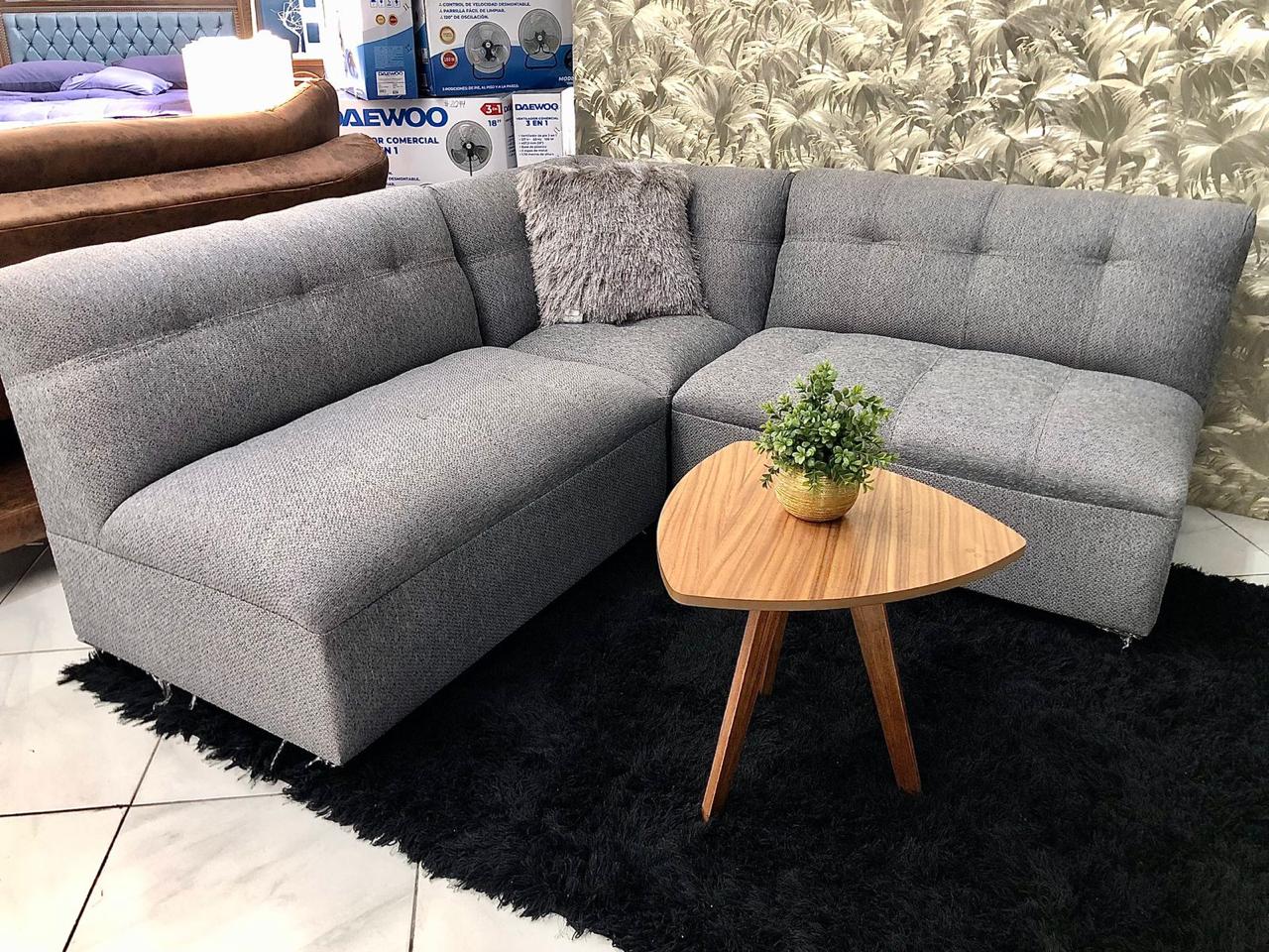 ·Seccional en forma de L tapizado en tela gris jaspeado.