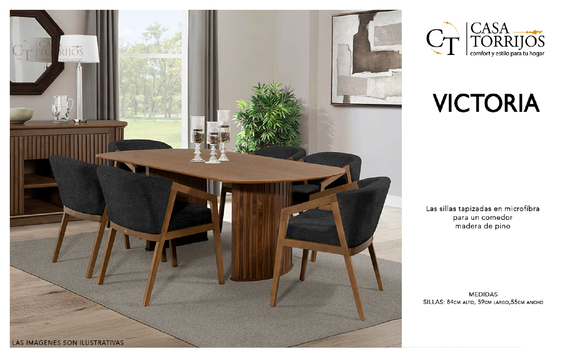 - El comedor Victoria impresiona por la textura de su pedestal cilíndrico y su tabla ovalada, que ofrece una estética refinada. Las sillas negras con brazos contrastan con la madera cálida y brindan un soporte cómodo. Perfecto para hogares que buscan sofisticación contemporánea.