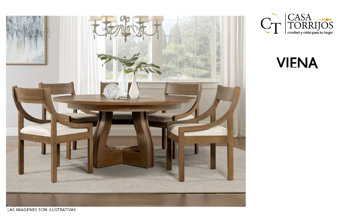 VIENA combina modernidad y confort. La mesa rectangular con patas inclinadas ofrece una silueta contemporánea, mientras que las sillas en negro aportan contraste y confort gracias a sus amplios reposabrazos. Ideal para espacios modernos que buscan personalidad.