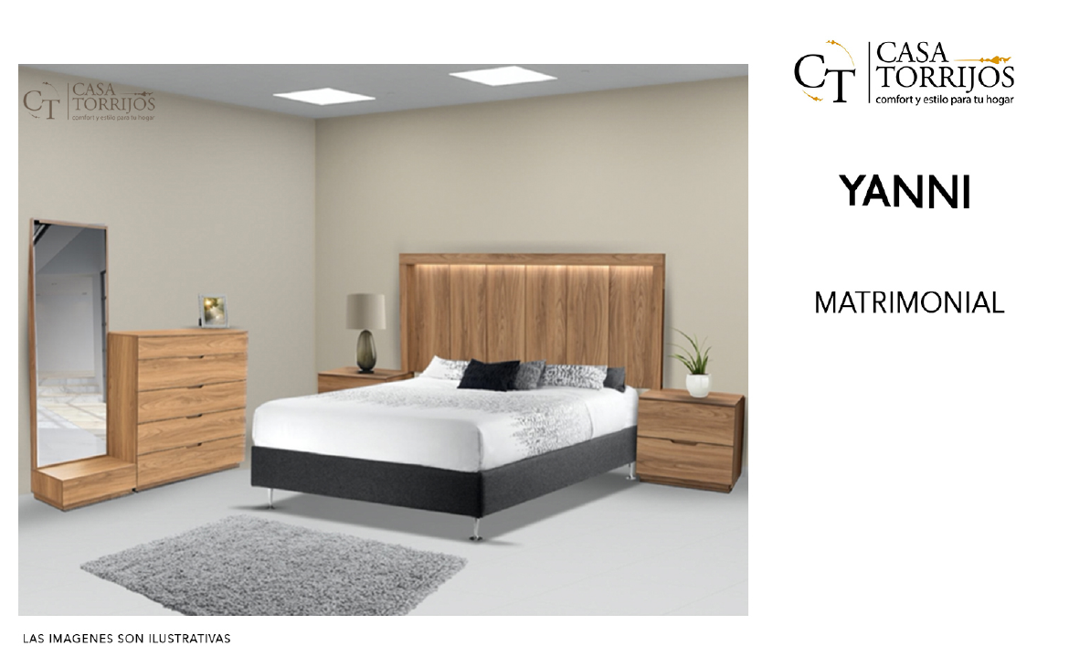- Yanni ofrece una atmósfera cálida gracias a la veta natural de la madera y la iluminación indirecta de la cabecera. Sus muebles de líneas rectas y tiradores discretos añaden funcionalidad sin recargar el espacio. Ideal para dormitorios minimalistas que buscan calidez.